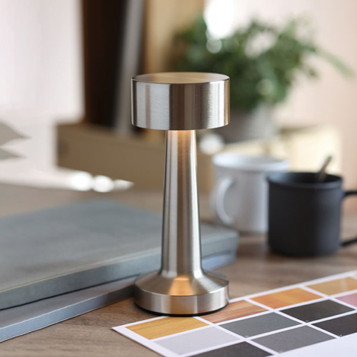 Stolna lampa od željeza s 12 LED žarulja, kontinuiranim zatamnjivanjem, 3 načina rada svjetla i dodirnim upravljanjem. USB priključak i punjiva Li-Ion baterija od 1200 mAh. 6 sati rada nakon potpunog punjenja. Uključuje kabel za punjenje.