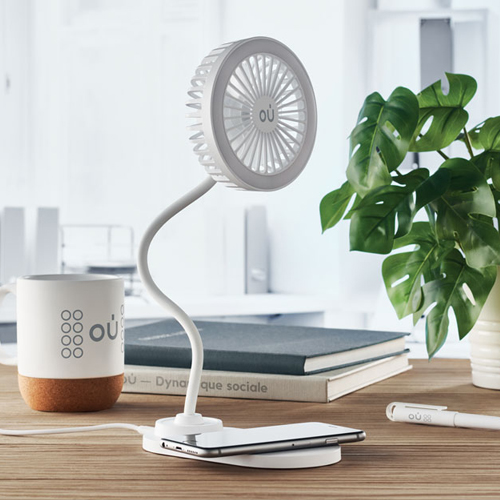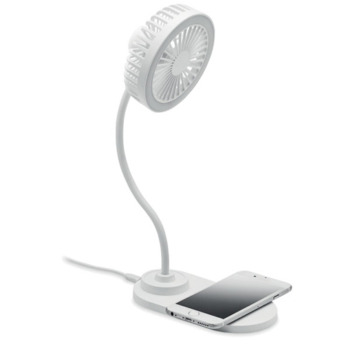 ABS stolni ventilator s 3 postavke brzine s LED svjetlom (80 lumena) i bežičnim punjačem od 10 W. Izlaz: DC 9 V/1,1 A (10 W) za brzo punjenje. Kompatibilan s najnovijim Androidima, iPhone® 8 i novijim.